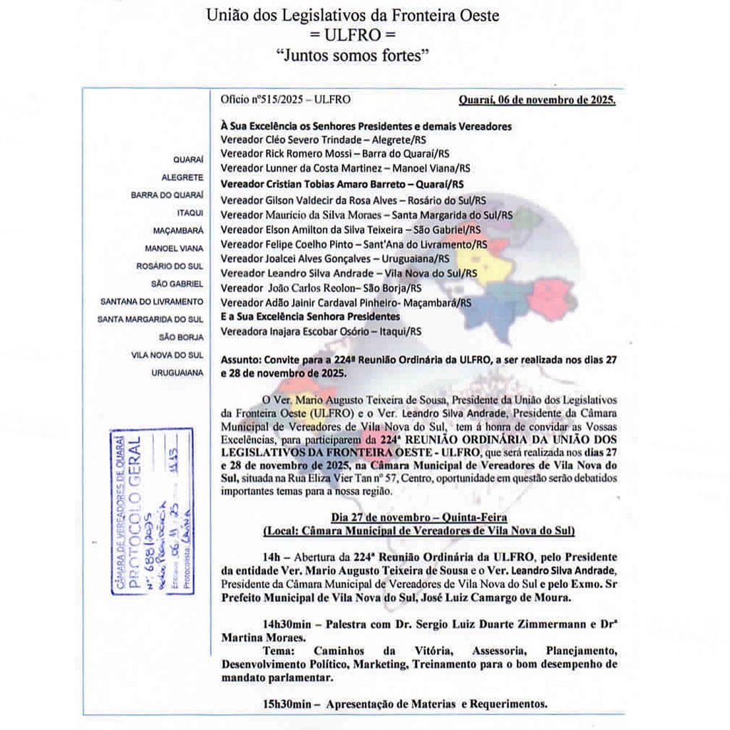 Marque na agenda: dias 27 e 28 de novembro de 2025. O encontro da União dos Legislativos da Fronteira Oeste (ULFRO) é essencial para o futuro da nossa região.