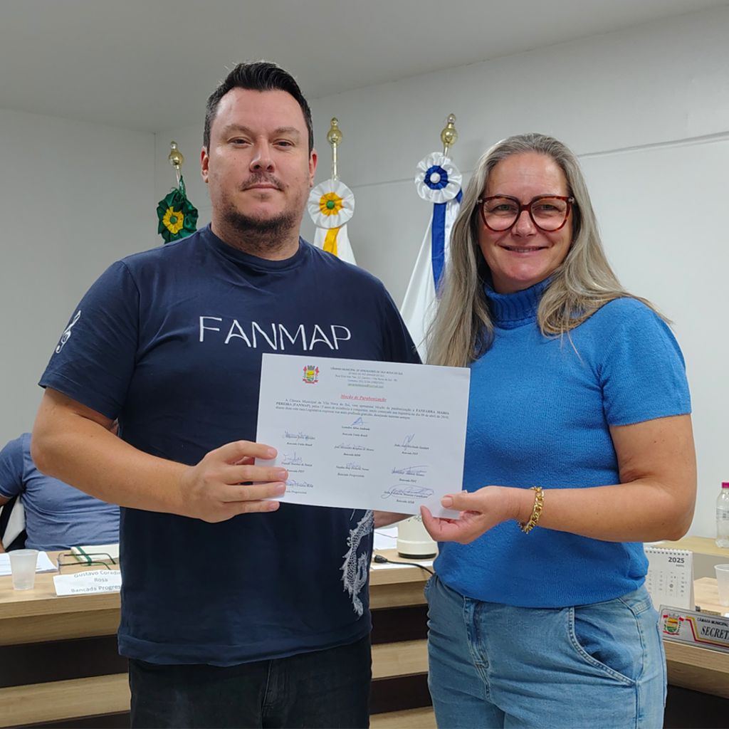 Na sessão realizada na noite desta segunda-feira, 14 de abril, a Câmara Municipal de Vereadores de Vila Nova do Sul, prestou uma homenagem especial pelos 15 anos de fundação da Banda Fanfarra Maria Pereira (FANMAP), criada em 9 de abril de 2010. Jovens integrantes da banda marcaram presença no evento, que foi marcado por emoção e reconhecimento. Paulo Sérgio destacou a importância da FANMAP na formação cidadã e educacional dos jovens, contribuindo para o desenvolvimento cultural do município.