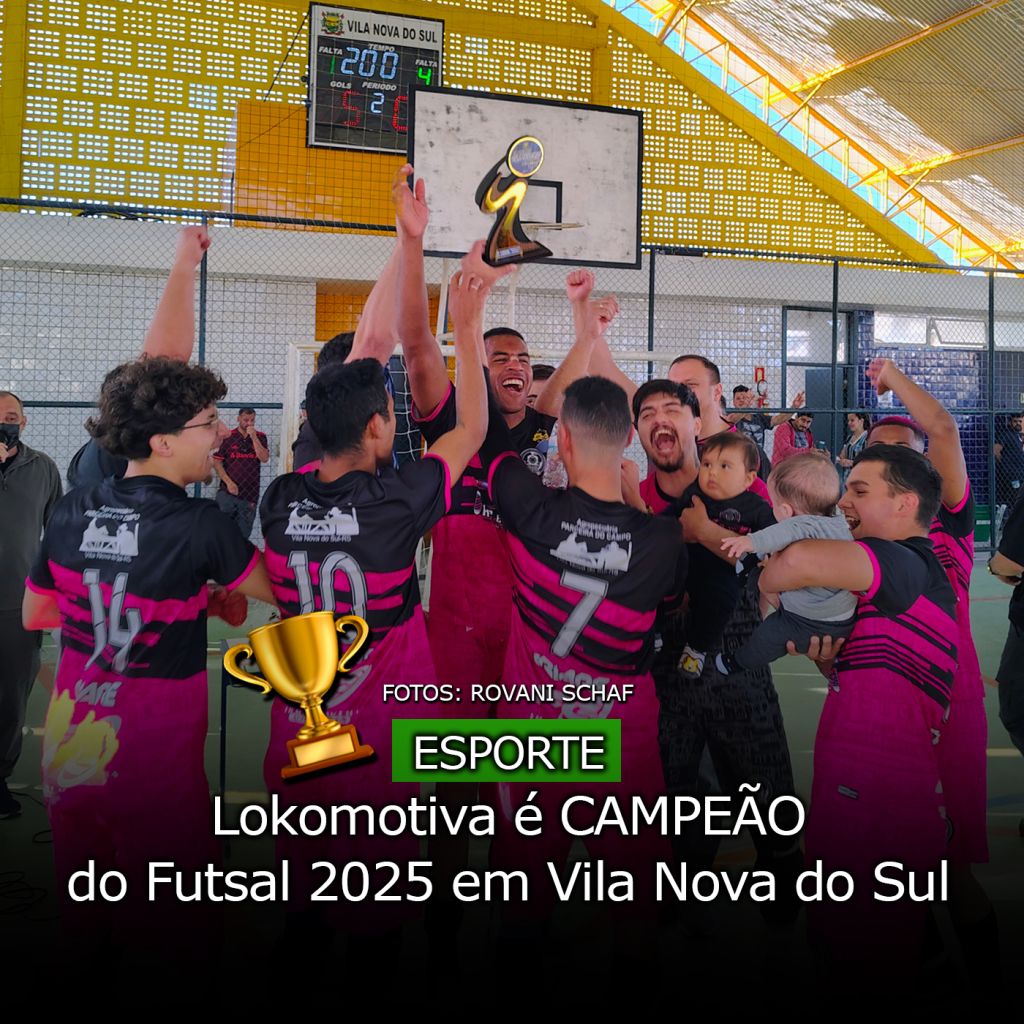Neste domingo, 19 de outubro, o Ginásio Municipal de Vila Nova do Sul foi palco de uma final inesquecível! O time LOKOMOTIVA se consagrou o grande campeão do Campeonato Municipal de Futsal 2025, vencendo o forte time do Aston Villa por 5 a 2!